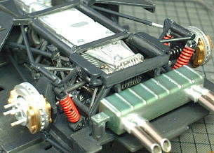Lower-arms of rear suspension are very narrow and fragile. I reinforced them and other narrow parts by inserting brass lines. Rear suspension of this kit is set up high-waist to share with Type LP500S(Walter Wolf Special) that is equipped with over-fender. I shortened the length of rear dumpers. In this way, the height was adjusted to proper value.