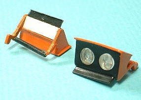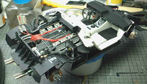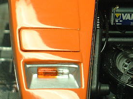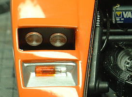 The pop up headlight unit is composed of two pieces parts. I unified them and expressed the panel line by painting. Because the big gap occurred for those parts. As for the inside of headlight units, the aluminum tape was attached in the entire surface. The shaft is covered with the vinyl tube and it had the effect of loose stopper. The Parts that attache a shaft to body were remodeled in accordance with the optimal action of pop up headlight units. I added some beams of triangle so that units do not drop out.