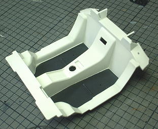 The floor carpet was made from a felt. None slip rubber was made from a inner paper of cigaret case that was painted black. Accelerator pedal hinge of real car is in a floor. I modified it because the kit was wrong. The protection metal plate of the accelerator's side is made from an aluminum tape.