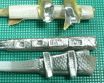 帯モールドはマスキングテープ、鋲は伸ばしランナーの輪切りで再現しました。フレームの外枠は段違いになってますので0.3mmプラ板を細切りして付け足してあります。