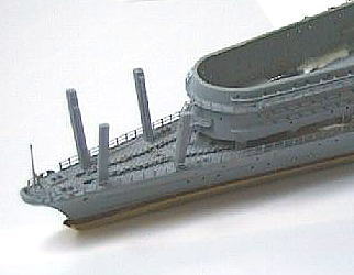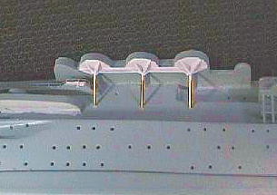 艦首の支柱ですが、飛行甲板側のキットの取り付け位置の通りにすると前後の支柱の外側への傾きが平行にならなくなるので、取付け位置を変更しました。