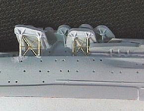 トラス支柱に装着されてるものを含めてライフボートは分厚いので、薄く削っておきます。そして艦尾の支柱の間の筋交いを真鍮線で再現しました。