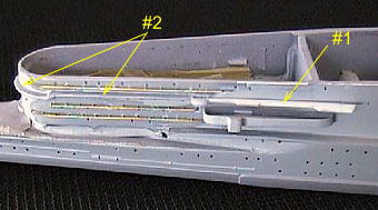 飛行機格納庫のキャットウオークは、見張り方向盤から後ろが省略されているので新造し(#1)、礼砲と見張り台双眼鏡を取り付けておきます。それに合わせてキット側のほうのキャットウォークも断面を薄く削りこみ(#2)、主砲用の測距儀のあるスポンソンを取りつけ位置を1o下げます。