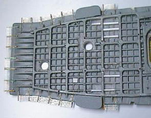 ここの専用パーツは、トムズモデルスPE57WWII日本海軍空母用2のとゴールドメダルモデルのPE14日本海軍空母用のそれぞれに付いています。しかしどちらにも短所があり、前者は材質が真鍮で柔らかすぎて強度不足です。後者は組み立て式の四面構成ではなく一枚板になっており、奥行きがなく不自然です。