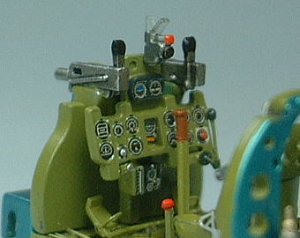 省略されている計器板下部の燃料注射ポンプとオイル冷却器シャッターのユニット、右端の滑油冷却器通気調整扉操作レバーをそれぞれ再現しました。