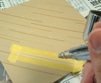 木板を一枚ずつマスキングしてエアブラシ塗装で木目表現しました。