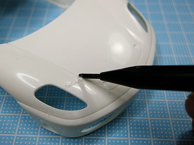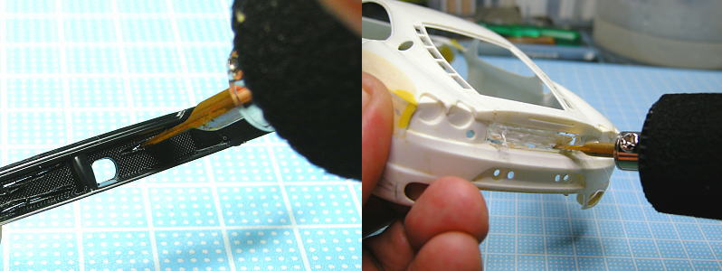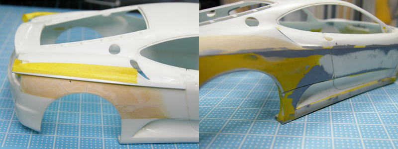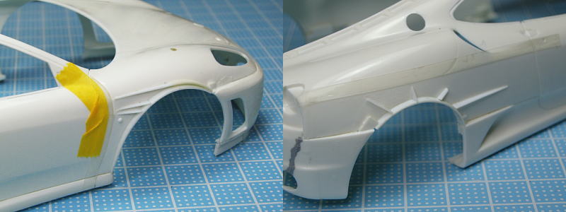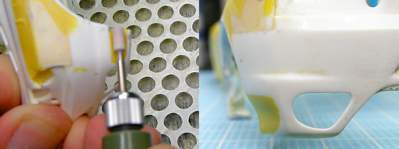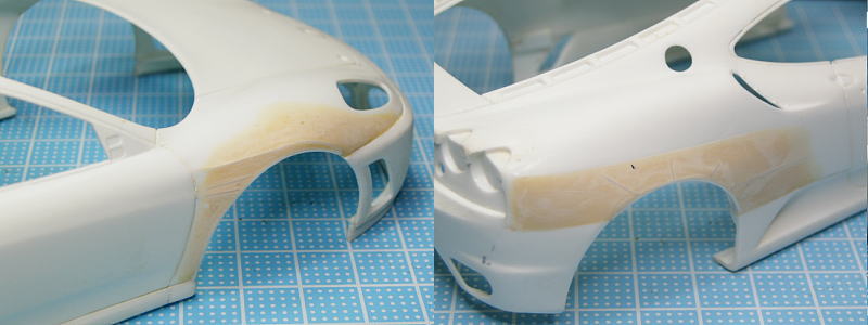 GTCのリヤバンパー側面下部はえぐれてますので、ポリパテを裏打ちし、ルーターで削って再現しました。