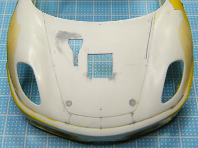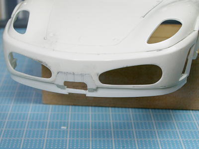 続いてエアインテークですが、GTCのそれはチャレンジより大きく、そして形状も違ってますので、純正パーツをベースにそのように改造、フロントバンパー側もそれに合うよう改造します。一見簡単そうですが、起伏のある曲面とエッジの効いた角を再現するのはなかなかどうして難しく、ここで大きな時間を食いました。