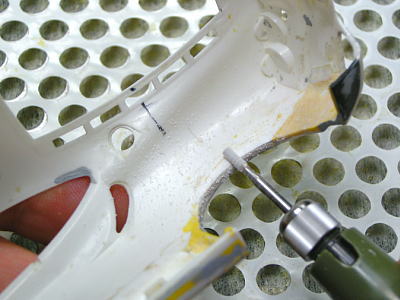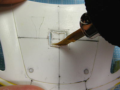 Welderでくり抜きます。そして裏からメッシュを貼るだけでも結構イケますが、実車同様に中のエンジンルームが見えてるとより見映えしますので、ボディ側もくり抜きました。