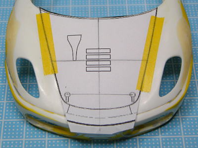 組立説明書の上面図をスキャニングし、PCのドローソフト上でNACAダクトとルーバーを書き加え、実物大でプリントアウトしたものを、ボンネットに貼って型紙とします。