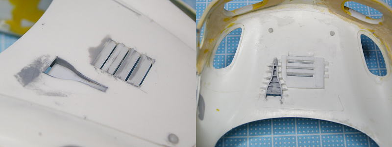 プラ板でNACAダクトとルーバーを造形。後で破損しないよう裏側からしっかり補強しておきました。
