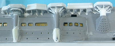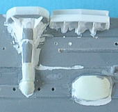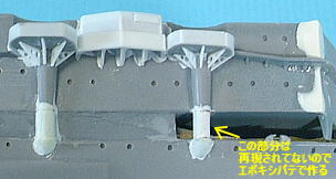 こうして作った舷側構造物を船体に取り付けていきます。高角砲座下には肉抜き穴を開けた三角形の梁を設けます。 接着部分には船体との間に結構な隙間が出来るので、ここを溶きパテで埋めてやります。(画像で接合面に塗りたぐられている白い塗料のようなモノが溶きパテです。) さらに両舷の前方高角砲座支柱付近には、機械室かボイラー室の通風路らしきブリスターがあるのですが、キットでは省略されているのでエポキシパテで再現します。