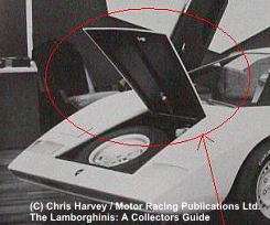 パネルの分割ラインが異なっており、トランクの上端にエアスクープのような段差が設けられています。さらに開閉は、LP400とは正反対の後ろヒンジ式になっています。