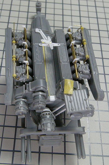 塗装を行い、Vバンク間の冷却管、ウォーターポンプまわりの配管、プラグコードなどを取り付けてエンジン完成。