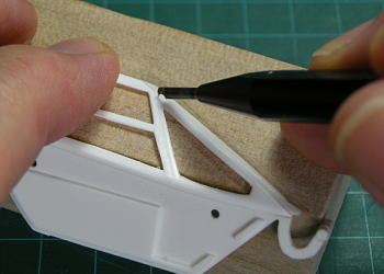 窓枠のパネルラインは凸モールドなので凹に彫り直しました。ダイモテープでガイドを貼ってクレオスのラインチゼルでスジボリ。