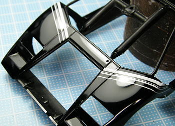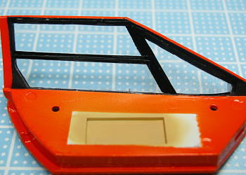 スモークでサンシェード塗装し、ボディに接着したとき断面が接着剤で汚く見えないように、あらかじめ黒で塗装しておきます。