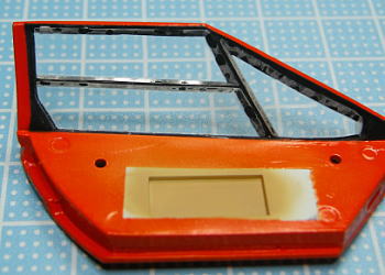 クリアパーツが白濁しないようにエポキシ接着剤で付けてますが、内側から見るとご覧のとおり接着面が小汚いです。しかもパーツの合いが悪いので、フロントウインドウみたいに断面を先に黒く塗ると、それが表からも見えてしまいます。