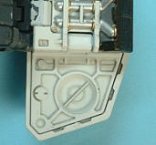 ■脚部の製作 脚部も腕部とおなじで、膝関節がゆるくハッチの開閉が悪いので同様の処理を施します。中でも皿にあたるC9の装甲ははずれやすいです。 あと太もも裏側や膝の横にダンパーがモールドされていますのでアルミ箔を貼って金属感を出しています。 脚部メンテナンスハッチ部分 太もも裏側部分