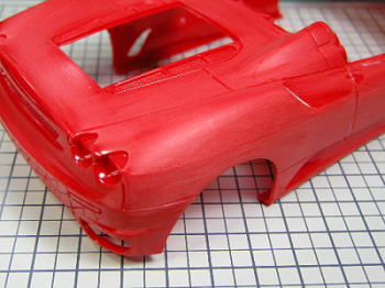 プラモデルのキャビンは何故かやたら角張ったものが多いですが、このF430スパイダーも例に漏れずカクカクですので、ヤスリや荒めのペーパーで全体の角を落としてやわらかい感じにします。
