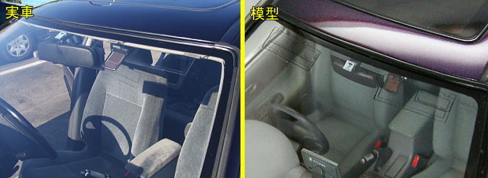 | フロンドウインドウ上部のフィルムアンテナ再現。検査標章の日付も実車に合わせてある。 |