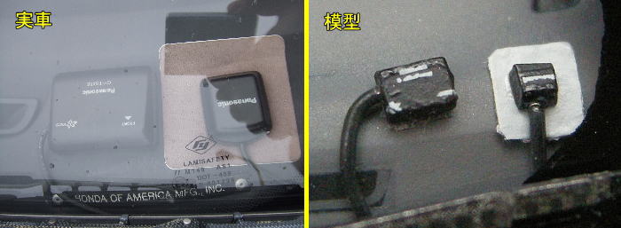 | VICSユニットとGPSアンテナ再現。フロントウインドウの厚みのため、実車より少しだけ位置をずらして設置。 |