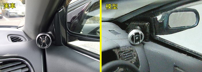 | Aピラー根元のスーパーツィーター再現。ピラーとのチリが極力合うように調整した。 |
