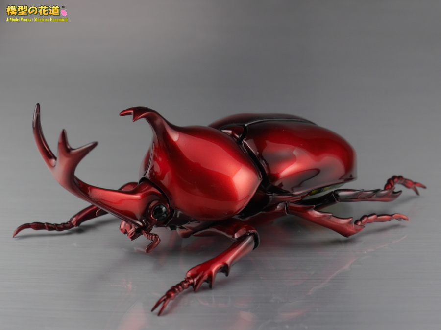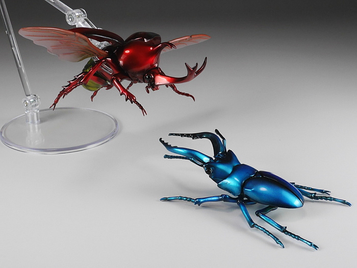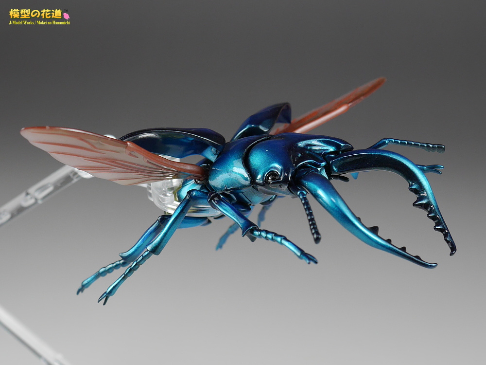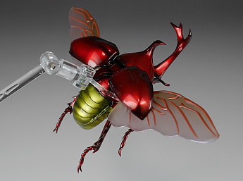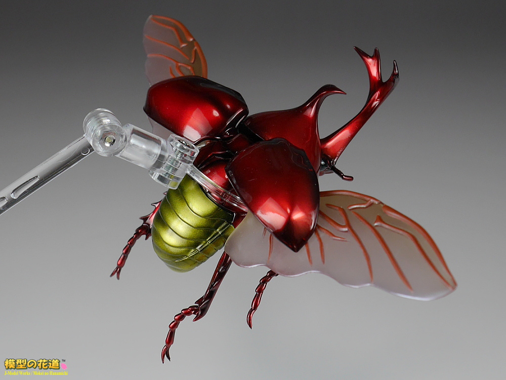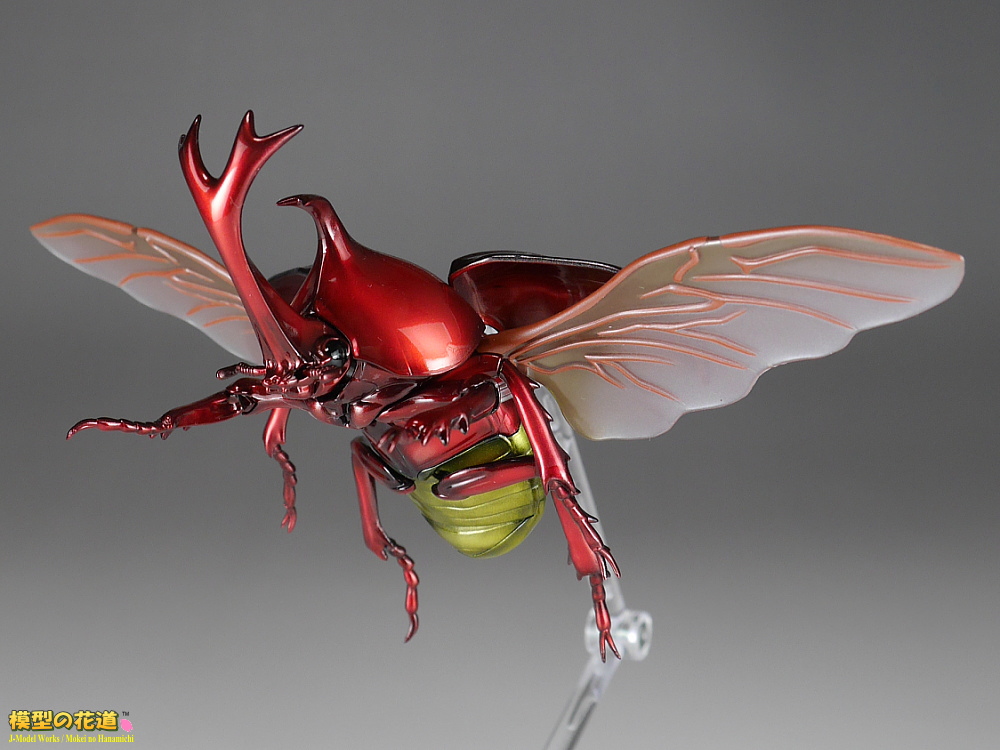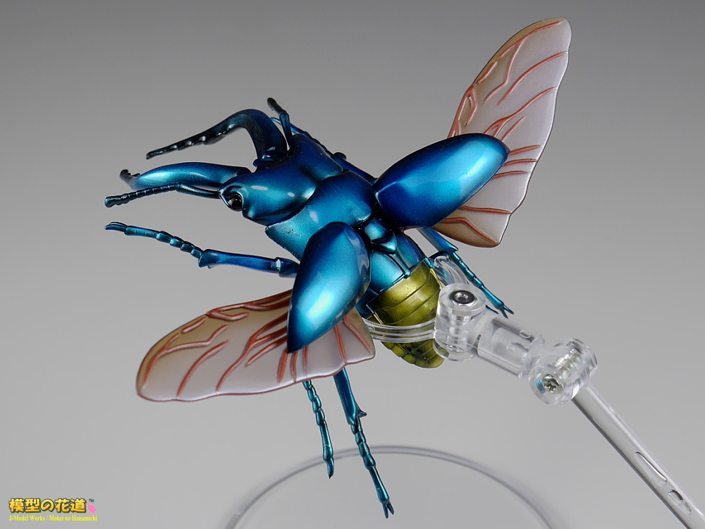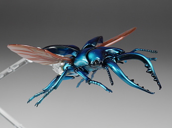 前翅(まえばね)は展開可能で、開けた状態で後翅(うしろばね)を差し込むことで飛行状態も再現できます。脚や胴、頭といった各関節もボールジョイントで360度方向にグリグリ動きます。ただしその可動方向の自由さに比べて可動幅はあまりないので、色んなポーズを付けて遊ぶのにはやや足りない気もします。