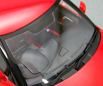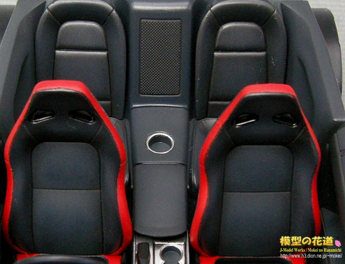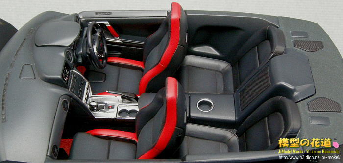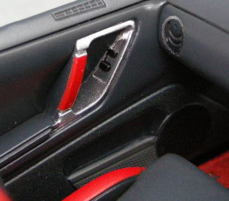 | 今回はブラックエディションに準じた内装色で塗装。シートやドアノブに赤いワンポイントがあるのが特徴です。 |
