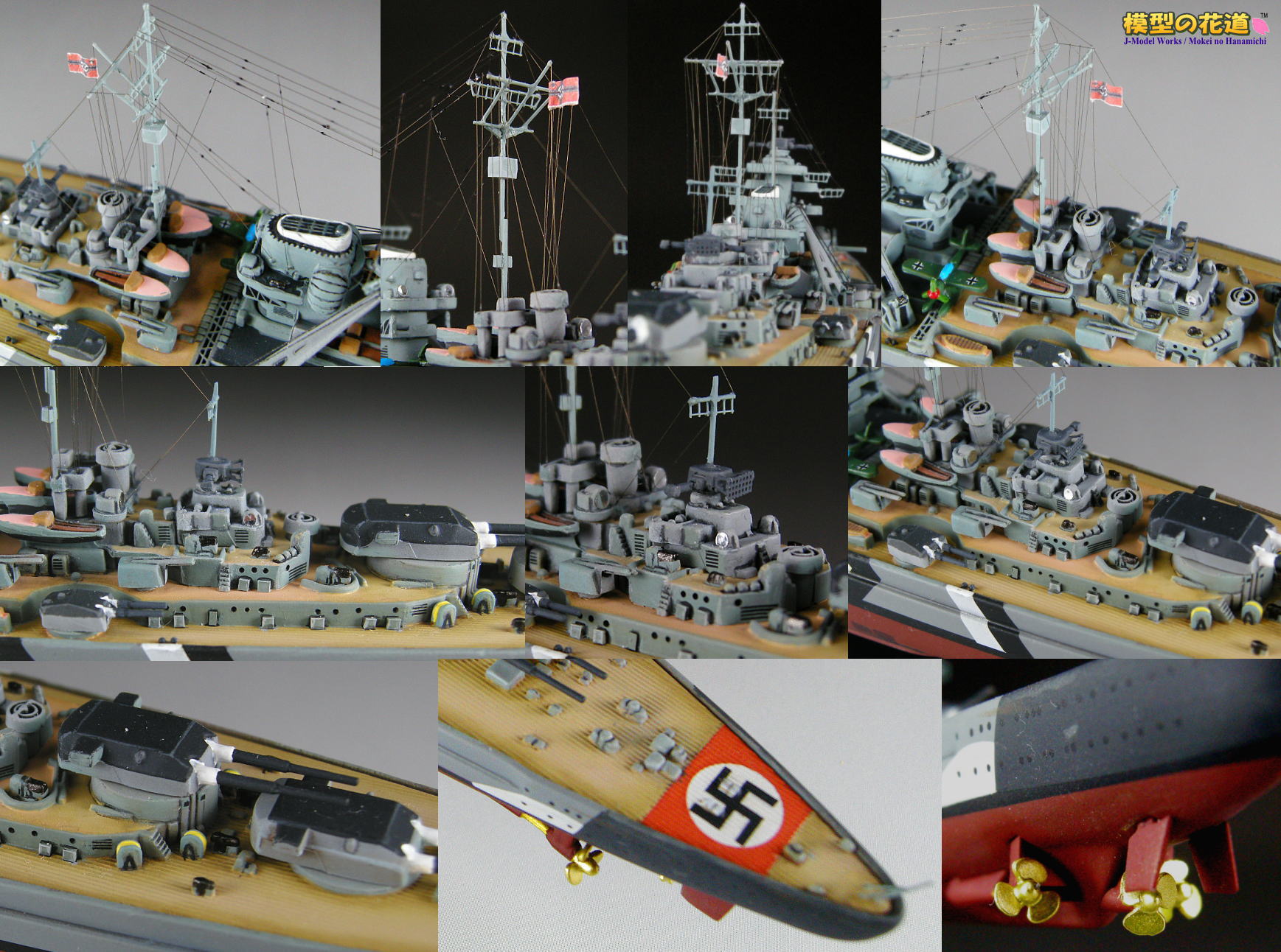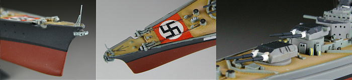 | 艦首錨と旗竿追加。船体と上構物各所にシャドウとハイライトを入れて起伏を強調。鉤十字の塗装はみ出しをタッチアップ修正。 |
