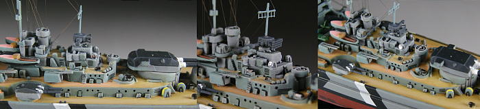 | 副砲のバルティックスキーム迷彩再現。クレーンの鉄骨構造を塗り分けで再現し、滑車とワイヤー追加。煙突両舷の探照灯カバー自作。艦載機をリペイント。 |
