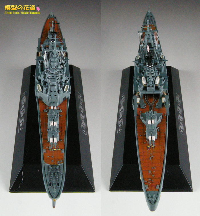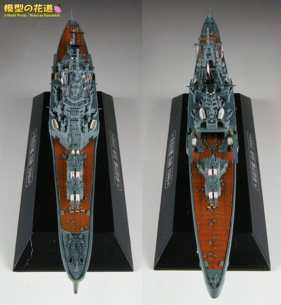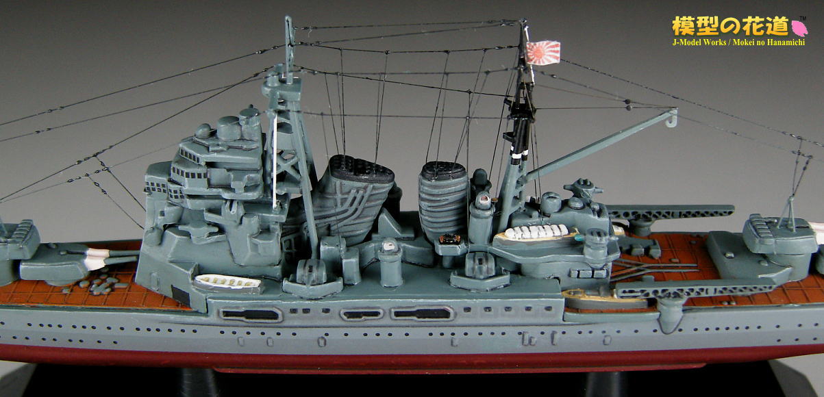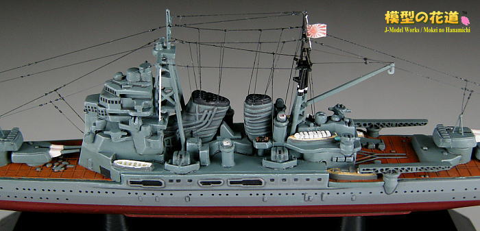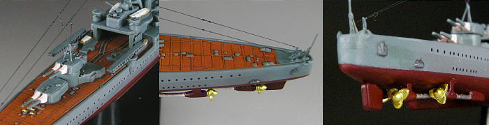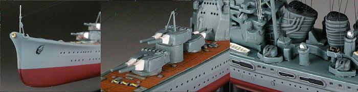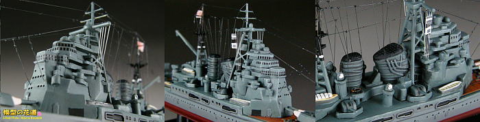 | フェアリーダー、御紋章板、菊花紋章、艦首錨、二番主砲上の空中線支柱を追加。一番煙突両脇の機銃はこの時期にはまだ装備されていなかったので削除し、二番煙突両脇の13mm4連装機銃は自作。 |