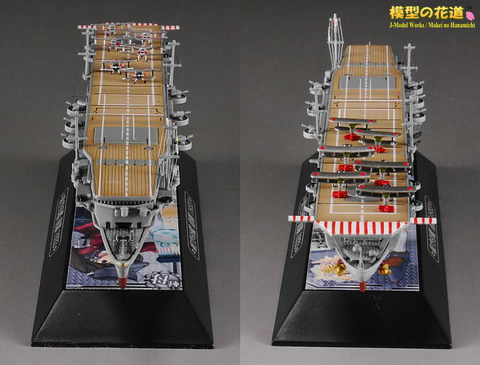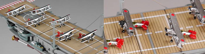 | 艦載機は飛行甲板から一度取り外して分解し、主翼と桁を薄く改修。主脚、魚雷を追加してリペイントし、自作デカール貼り付け。着艦制動索(アレスティングケーブル)はテグスを張って再現。