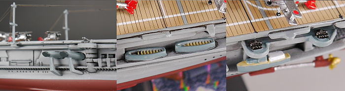 | 目立つパーテイングラインを処理してタッチアップ。装載艇、塗りの甘い装載艇や機銃などのアクセサリー類をリペイント。全体にスミ入れ。モデルカステンのメタルリギング0.06号で空中線追加。 |