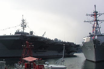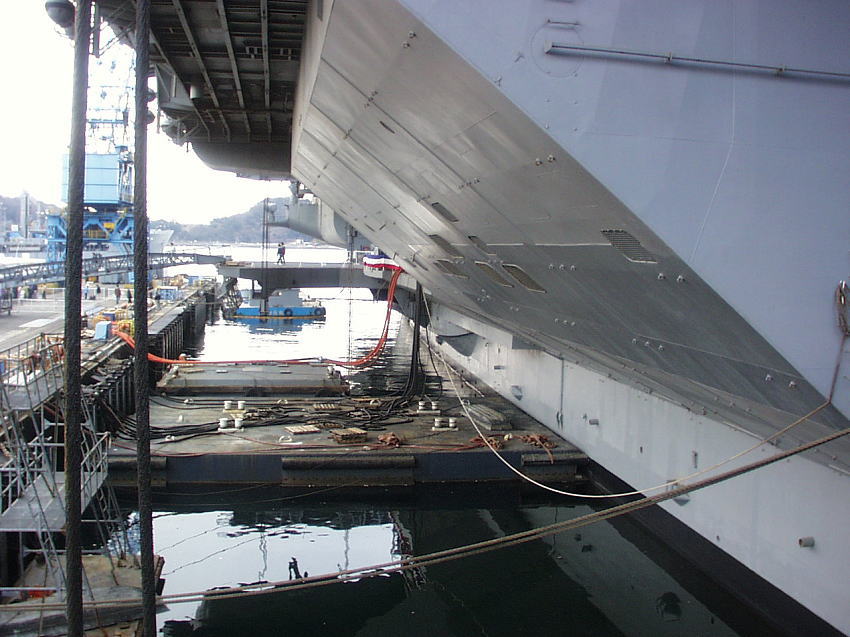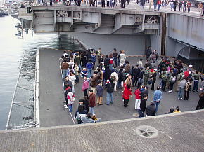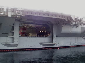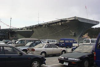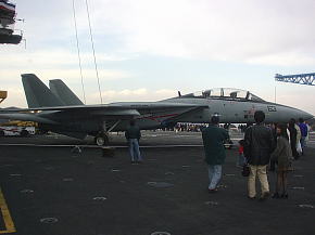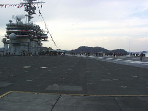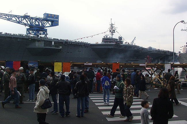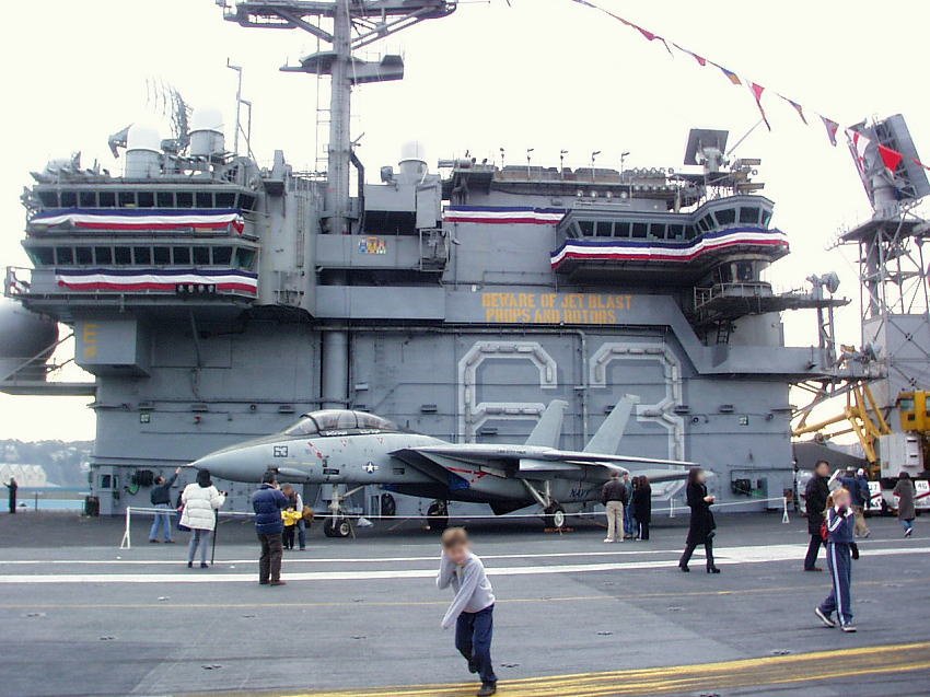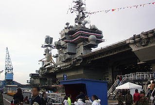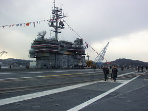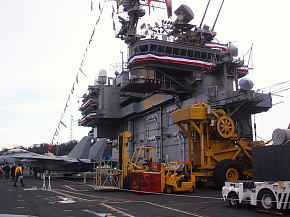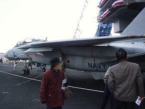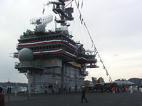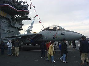 空母は母港に停泊しているとき航空打撃団は所属基地(この場合は厚木基地)に帰投してるので艦載機は載っていません。艦橋の横にクルーの移動訓練や消火訓練用のエンジンが抜き取られたF-14戦闘機が1機だけ展示されています。
