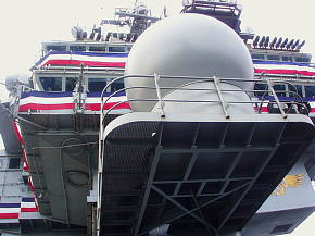 艦齢が45年を超えるキティホークの艦橋は時代に応じて改修を繰り返したため後付けされたデバイスが林立しており、全体のデザインもニミッツ級と違って直角面で構成され突起構造物も多くてスマートさに欠けます。ですがこの「バタ臭さ」が逆にキティホークの艦橋の魅力であり、角度によってさまざまな表情を見せてくれます。