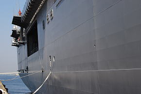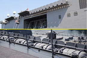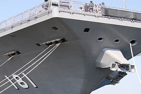 米空母や旧日本海軍の「大鳳」の様なエンクローズドバウ。外側にハッチを跳ね上げた開口部の奥にはローラーが並んでいます。正方形の小開口部も全てハッチを内側に跳ね上げる形になっています。ステルス性への配慮でしょうか。その割には係船孔は開きっぱなしだったりしてます。