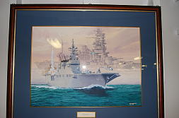 乗艦後、通路を抜け、ラッタルを上がって通されたのが「多目的区画」というプレートが掲げられた部屋。これはそこの壁面に掲げられていた額です。ヘリを発艦させつつVLSからミサイルを放つ「ひゅうが」と、バックには先代の航空戦艦「日向」。雑誌「世界の艦船」で紹介されていた様な記憶があります。