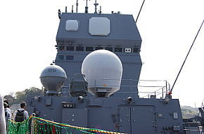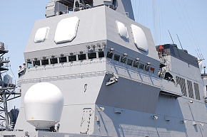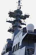 艦橋は従来の護衛艦と比べるとシンプルな印象の構造。マストは斜め後ろから見ると、なんとなく旧海軍の戦艦の前槽楼を連想させられます。