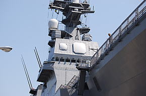 ひゅうがのデッキ左舷側には横須賀港の米軍区域が広がっていて、アーレイ・バーク級駆逐艦やタイコンデロガ級巡洋艦の奥に空母ジョージ・ワシントンの姿が。(1枚目) ただ、あまりの巨大さに背景の一部と化していて、周囲の見学者の中には指されてもなかなか認識できないという人も。