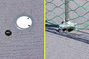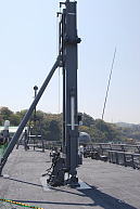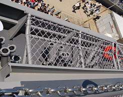 デッキ上一面に設けられている繋止環にはカバーが取り付けられていました。これが常時使用されているのか、今回の様に見学者が立ち入る場合にのみ取り付けるのかは不明ですが、うっかりふんづけるとパカパカと華奢な音を立てるので、変に気を遣いました。見学者誘導用の支柱はこの様に、繋止環に差し込んだ後で半回転させ、その後底部のネジでテンションを加えて固定する形式。(2枚目右画像)