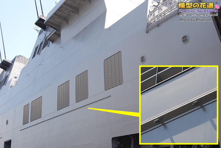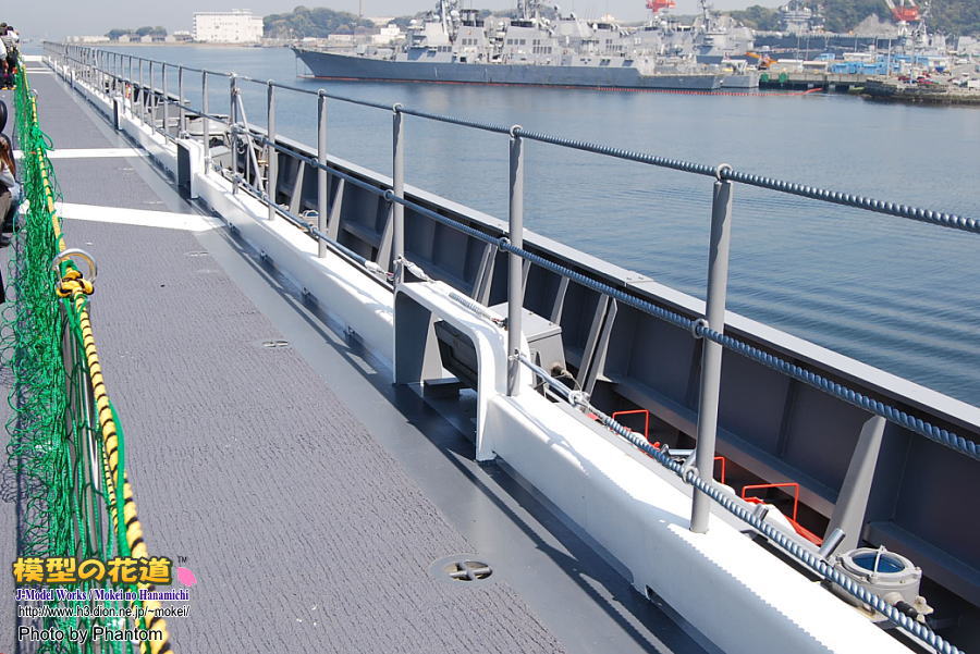 ヘリ運用上、航空甲板には係船柱を設けれないので舷側にその設備がある。 |