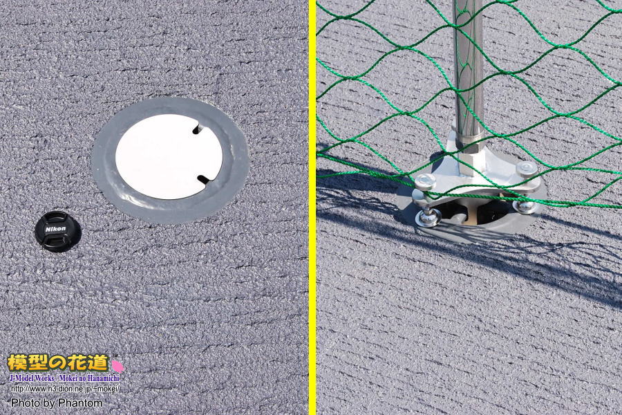 遠景写真では分かりにくいですが、デッキの表面処理はこんな感じです。(2枚目左画像) 対比物としてレンズキャップを置いてみました(直径6センチ弱)。