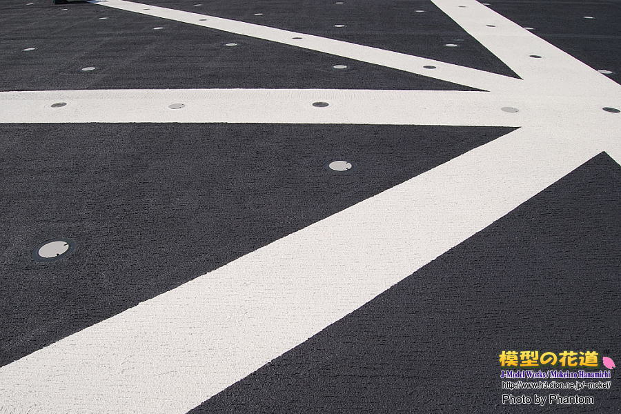 着艦標識部分には塗装と合わせて表示灯がデッキに埋め込まれています。繋留環の規則性に割り込む形で設置されている様に見えます。(3枚目)