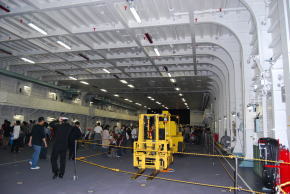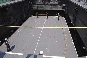 艦首側から見た、エレベーターが上昇してくる様子。意外なほど高速で上がって来ます。「その3」の画像では一見デッキと面一になっている様に見えますが、上昇してきたエレベーターは一瞬デッキ面より10センチ弱せり上がってからデッキと同一レベルに収まります。開口部のデッキ側には、繋止環に設置されている物よりやや太めのポールが並んでいますが、これらはエレベータが停止すると自動的にデッキに引き込まれます。