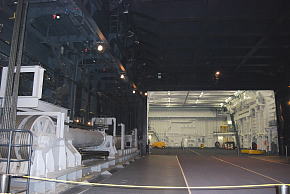 第2エレベーター(上がってる状態で裏側の格子状の梁が確認できる。) 奥の明るいエリアはヘリ整備場 |