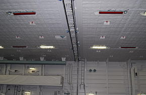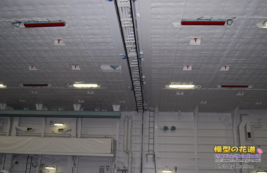 格納庫内の中央部付近の天井には、格納庫を前後に分断する形で防火スクリーンらしいものが引き込まれています。(3枚目) 画像の左手側が艦首寄りとなっています。スクリーンより艦首側は両舷にキャットウォークがありますが、艦尾側は左舷側のみとなっています。
