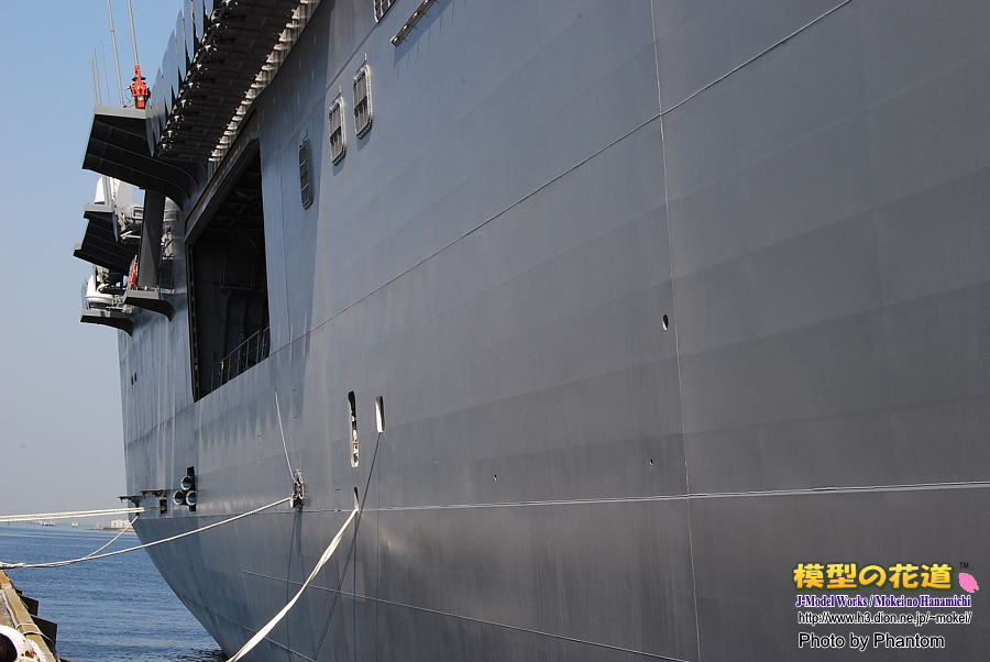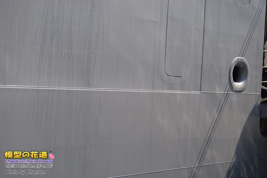 昨今では護衛艦の表面を表現した模型が増えていますが、やはり実物を間近で見ると色々と考えさせられます。ひゅうがの場合、先述のガスタービン吸気口や乗降口などの大きな開口部付近の外板は周囲より厚くなっています。溶接のビードの処理が意外にも荒っぽい印象です。