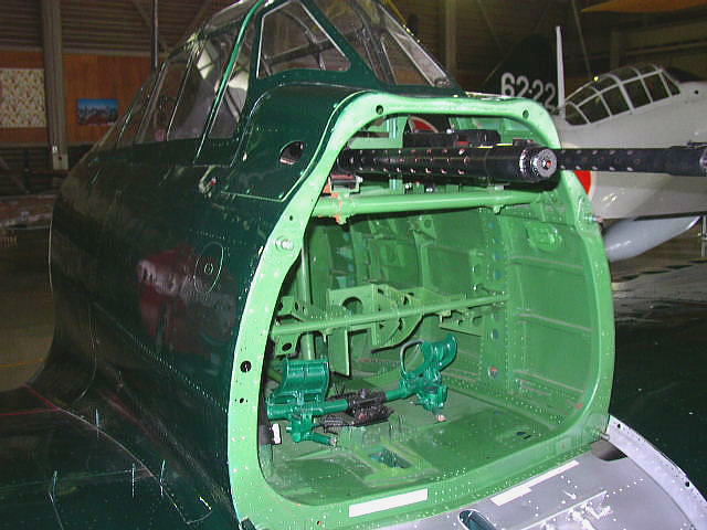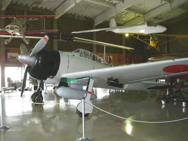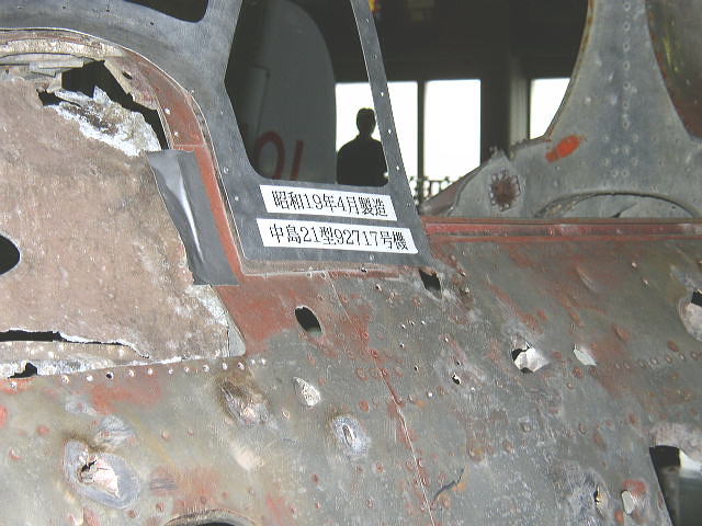 この機体はヤップ島から回収されたもので、復元の完了した中島製91518号機。21型は空母運用を前提としたタイプで、エレベーター幅に合わせて主翼の端が折畳めるのが特徴。