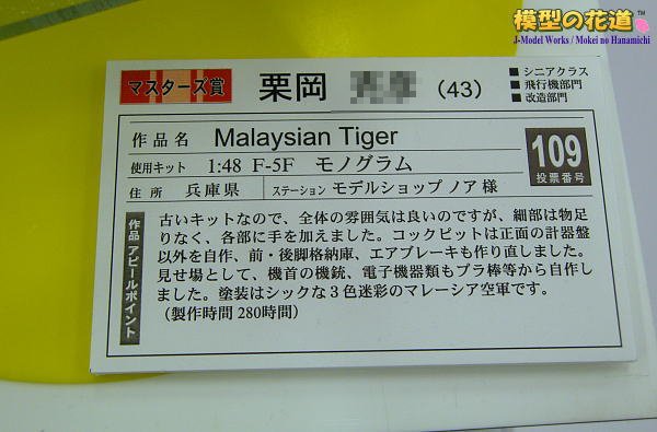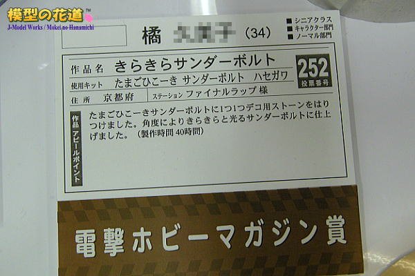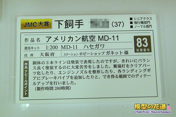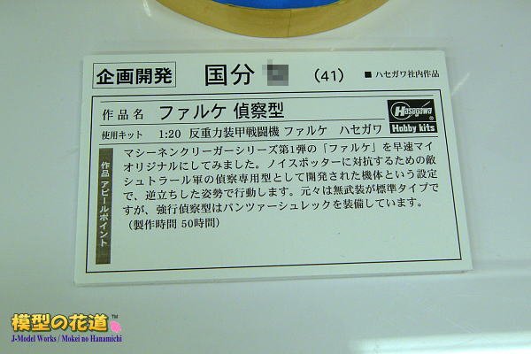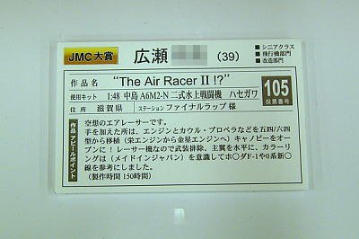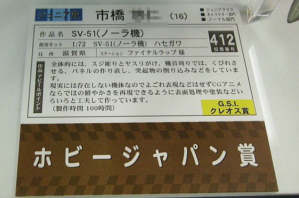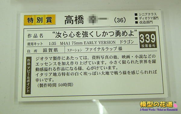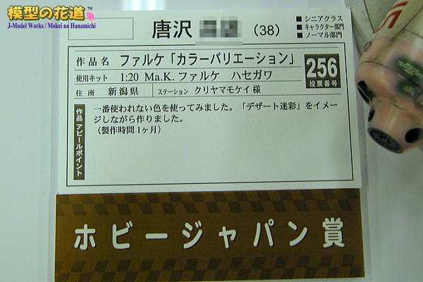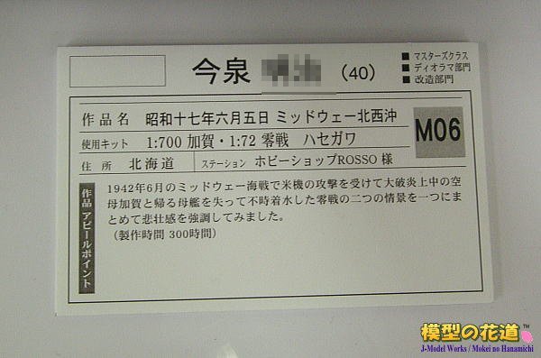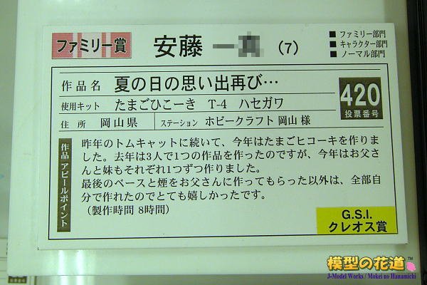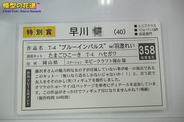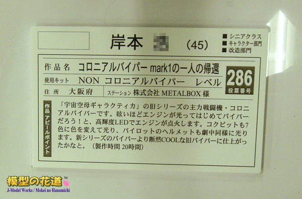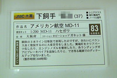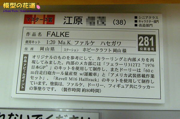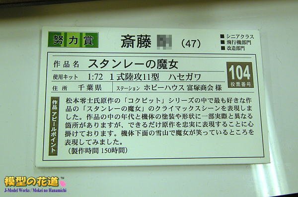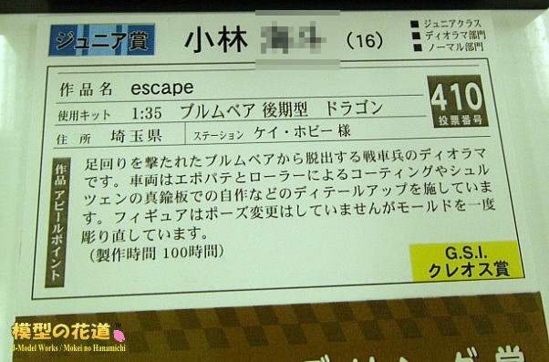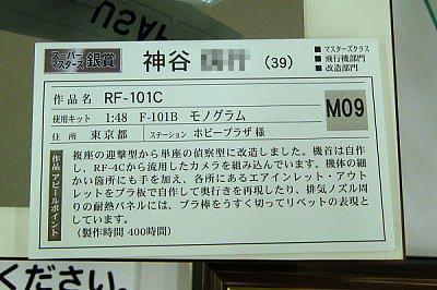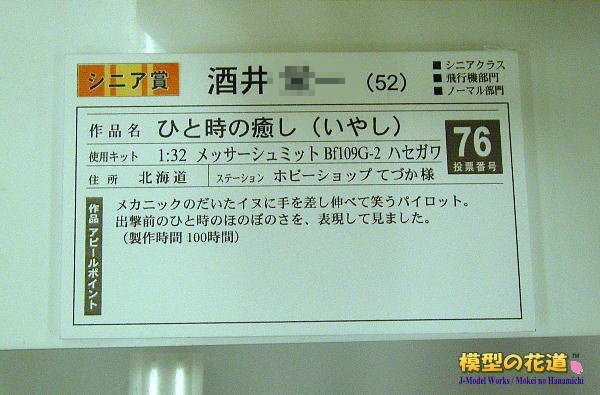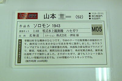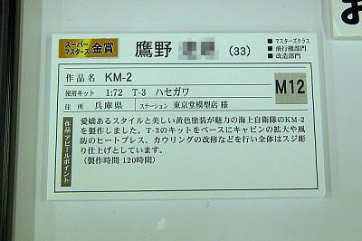 今回でJMC大阪を見に行くのが3回目となったのですが、出品作には常連が結構いるのに気付きまして、作風やキットのチョイスを一目見ただけでそれとわかったり、この人今年はこんな作品でエントリーしたんだという楽しみ方が出来るようになりました。 (2009/12/18)