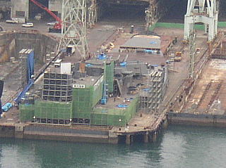 艦橋が鉄筋のみになりました。その鉄筋を吊るためかクレーンが2機に増えてます。